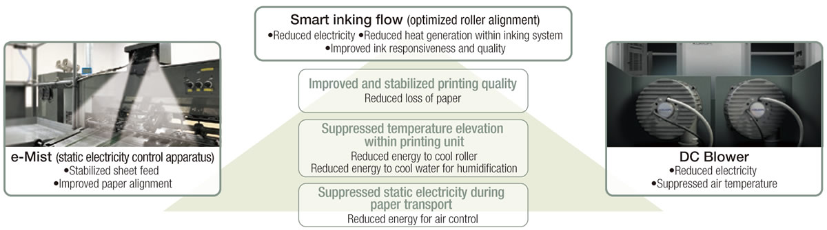 With the recent rapid changes in the social and economic environment, there is a growing need for management transformation through more efficient and labor-saving printing machinery, consequently ROI (return on investment) is given special emphasis. The LITHRONE GX/G advance Series has gone through constant technological evolution. In addition to superior specifications such as high-speed printing and various printing formats, the series has realized productivity improvements including reduced start-up and preparation time, automated presetting, and significantly reduced make-ready time, which greatly contributes to ROI. Since its development, the series has reduced CO2 emissions over its entire lifecycle, contributing to the sustainability of not only customers but also society.