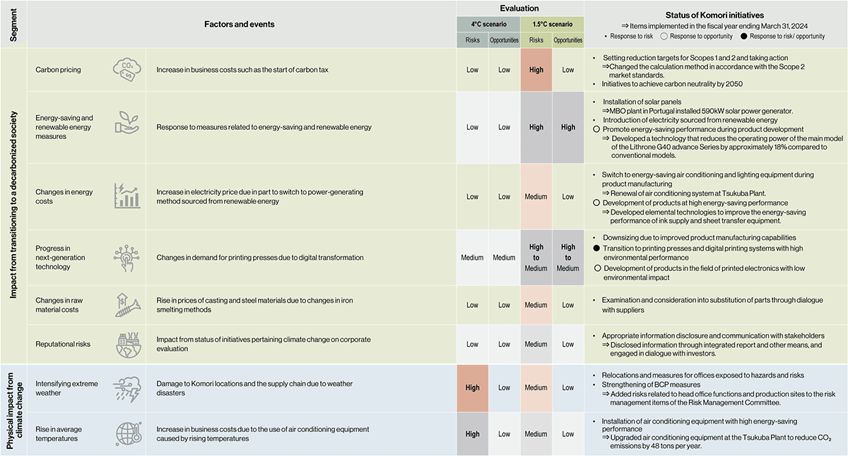 To consider the impact of climate change on business, scenario analysis was conducted, taking into account climate-related scenarios released by external organizations such as the International Energy Association (IEA) and the Intergovernmental Panel on Climate Change (IPCC). The analysis makes evaluations based on quantitative and qualitative aspects of impact of climate change as of 2030 as stipulated in Komori Eco Vision 2030.