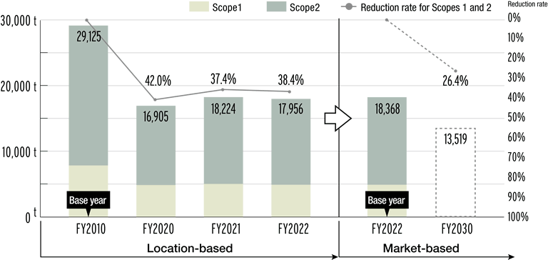 The company has been promoted activities to reduce CO2 emissions, such as setting a climate change target of a 50% reduction in total company CO2 emissions by March 2031 compared to March 2011, with an interim target of a 30% reduction by March 2021, in "Komori Eco Vision 2030" formulated in 2015. From March 2023, the calculation method was changed to use Scope 2 as the market standard in line with the trend towards standardization of greenhouse gas emission calculation methods, and the "Komori Eco Vision" was revised to achieve carbon neutrality by 2050. Scope 1+2 greenhouse gas emissions are targeted to be reduced by 26% by March 2031, with FY2023 as the base year.