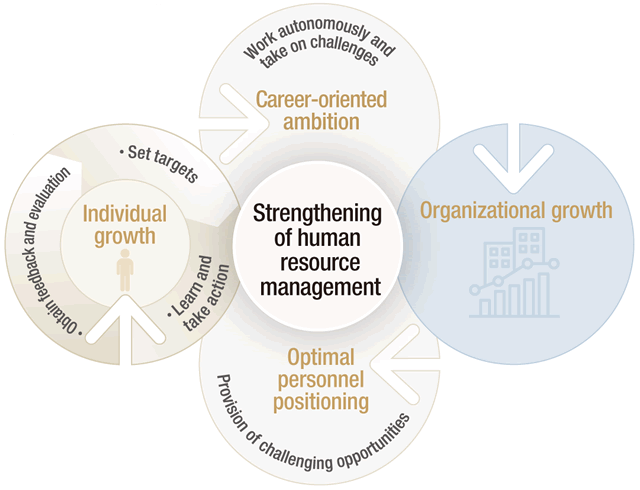 We are undergoing career development and evaluation, positioning personnel optimally so that: both employees and the organization can achieve maximum performance; highly fair, transparent evaluation can be carried out; and compensation in line with such evaluation can be provided. Utilizing the target management sheet set up every half year, supervisors and employees compare targets set and results achieved in a one-on-one meeting. Further, target management is tied to performance evaluation, and in evaluating achievements, results of the evaluation are also provided as feedback. Also, with self-assessment, individuals are free to include their ambition regarding future transfers and career aspirations, thereby allowing for each employee to be heard and for coordination in positioning personnel optimally as much as possible for the organization as a whole.