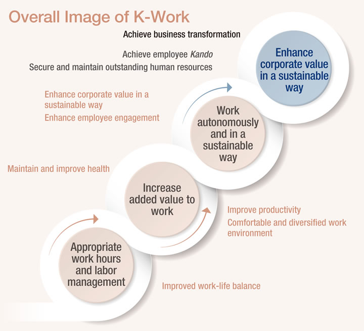 Employee engagement enhancement is one of the material issues for the Group's endeavors toward 2030 in the Long-Term Vision, Komori 2030. For Komori to continue enhancement of corporate value in a sustainable way, human resources are positioned as its most important "capital," and we believe initiatives for the enhancement of employee engagement is essential by realizing employee Kando, with the KOMORI-style Work-Style Reform that is challenging but rewarding positioned as the basis. We are working to strengthen human capital for the group overall, naming the KOMORI-style Work-Style Reform "K-Work," and implementing reforms in stages.